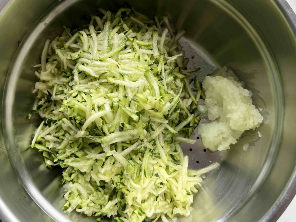 Comenzamos rallando la cebolla y el calabacín muy bien lavado, los ponemos a escurrir con un poco de sal durante media hora.