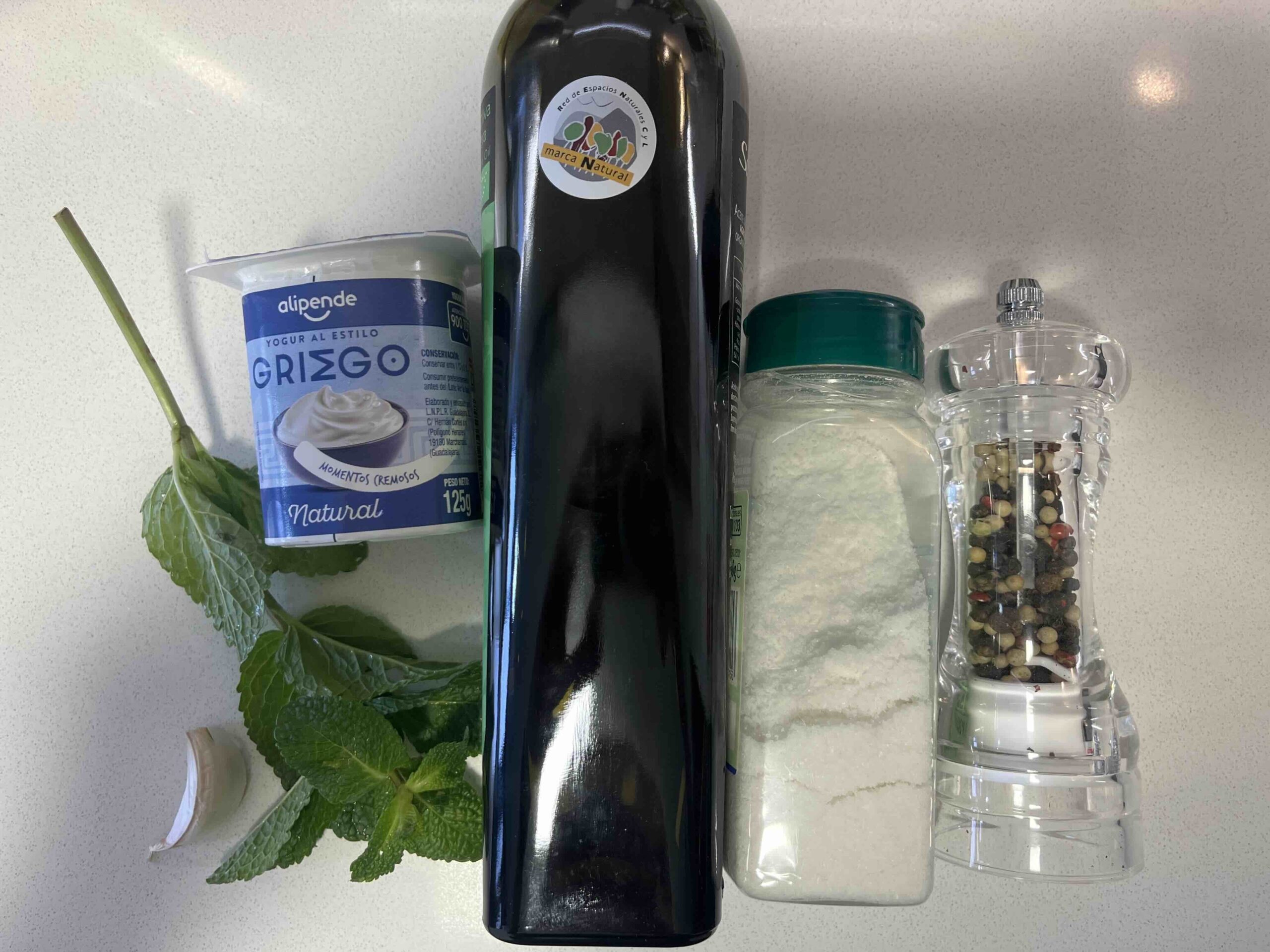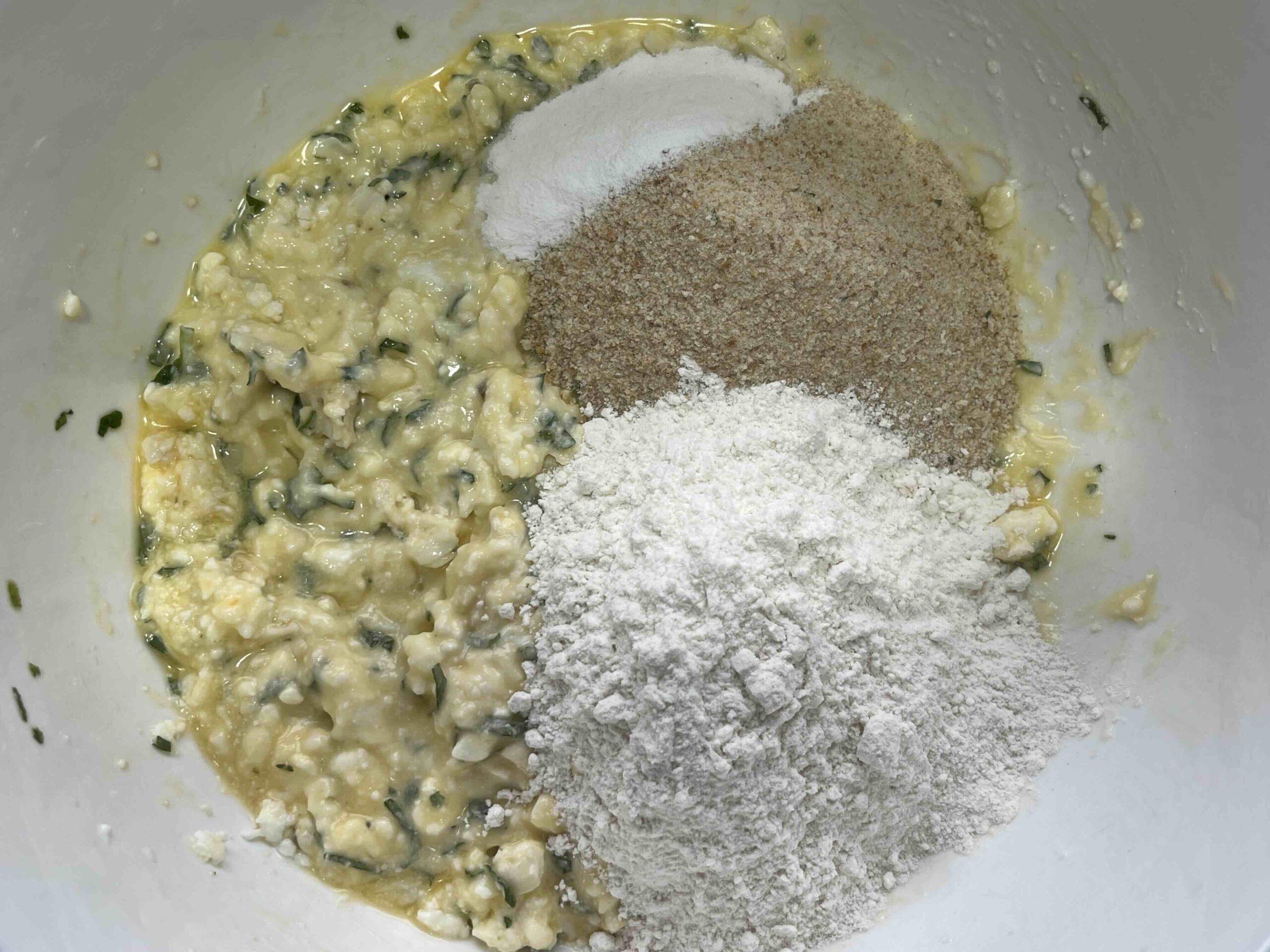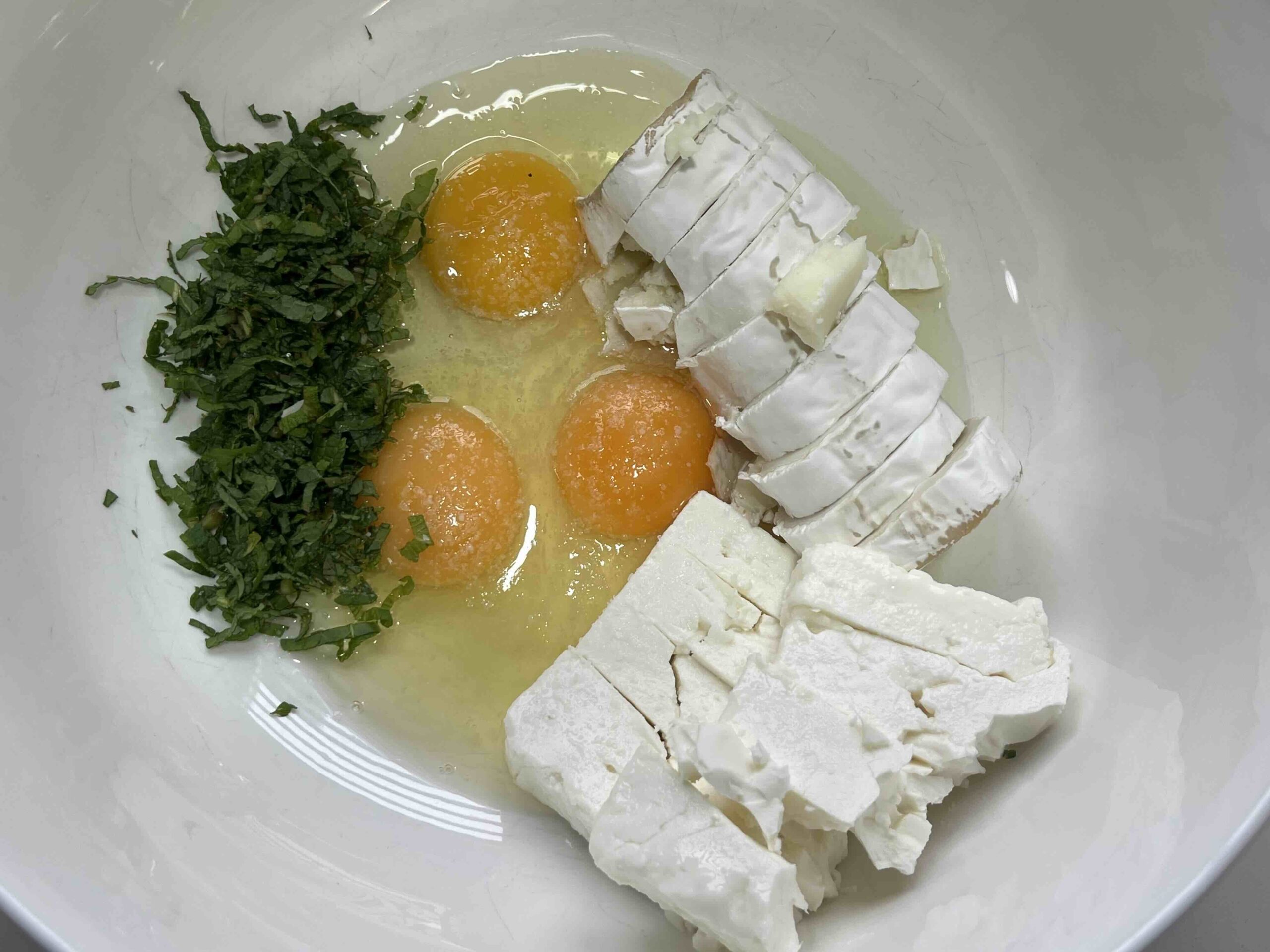 Mientras tanto mezclamos los huevos con los quesos y la hierbabuena picada.