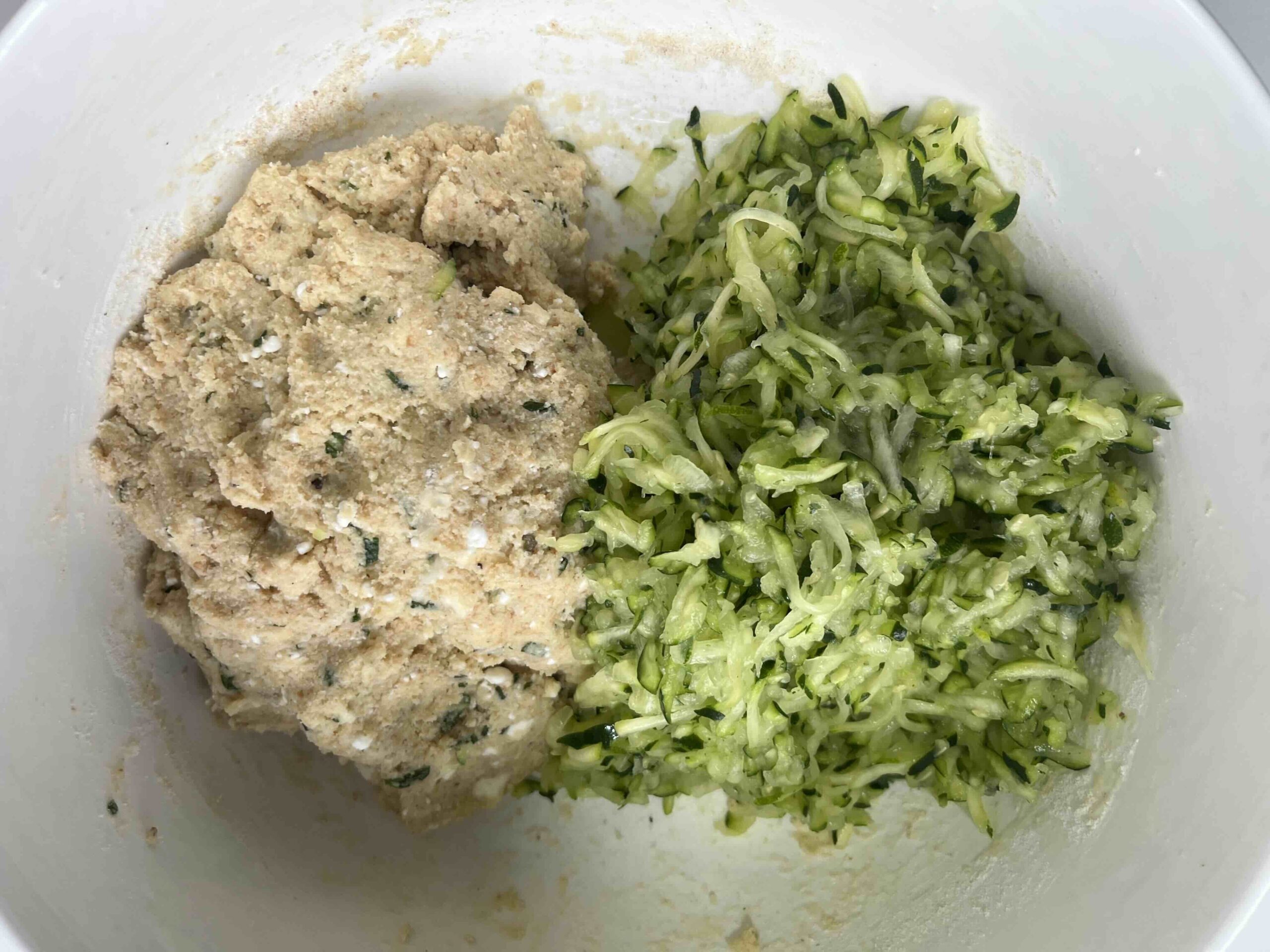 Apretamos el calabacín con las manos para que suelte todo el agua y lo incorporamos a la masa.