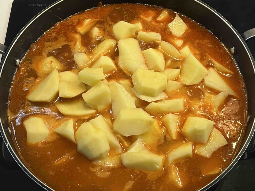 Echamos la pastilla de caldo, medio litro de agua y cascamos las patatas, lo movemos y dejamos cocinar 30’, tapado y a fuego lento.