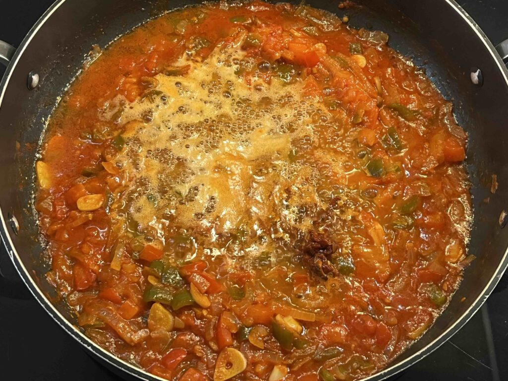 Después echamos el vino, la soja y la carne del pimiento choricero, dejamos un par de minutos al fuego para que evapore el alcohol.