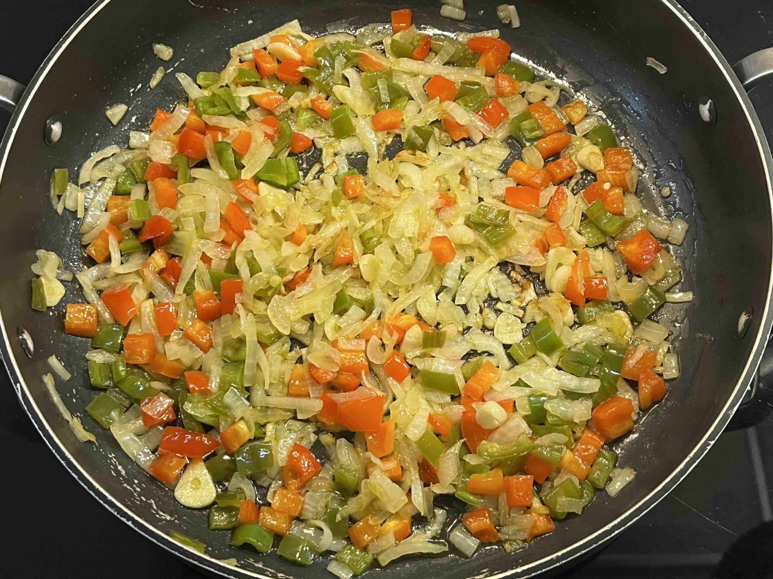 Ponemos a pochar la cebolla, ajo, pimiento rojo y verde picados, con un poco de sal, 15’. Mientras tanto metemos el pimiento choricero en agua caliente para que se hidrate.